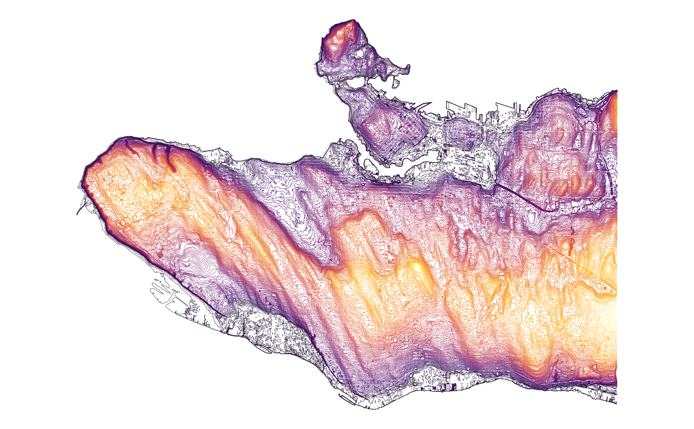 #> [1] "sf" "tbl_df" "tbl" "data.frame"Mapping the contour lines coloured by elevation takes only a few lines: